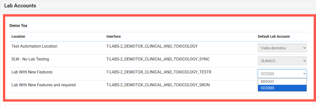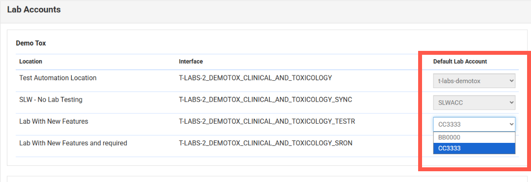 For lab interfaces that have multiple associated accounts, you can select the default account by simply changing the Account drop-down selections.