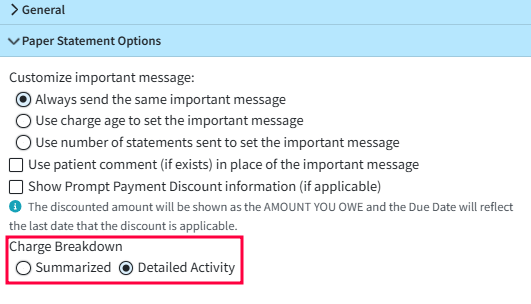 Detailed Activity: Select this statement layout to show one line for each charge, payment, adjustment, and info line.