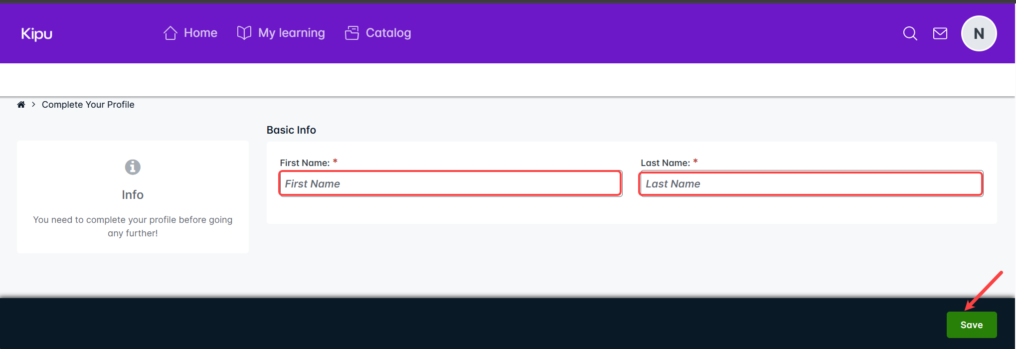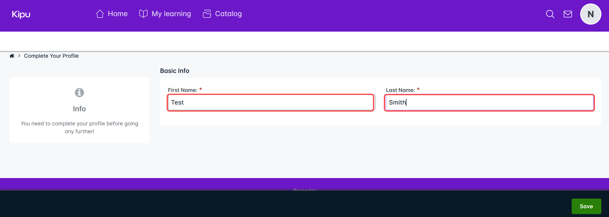 - Enter your first name and last name, and be sure to click Save. Scroll down to the Home Page section of this guide to continue.