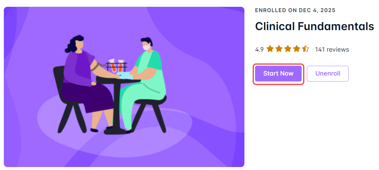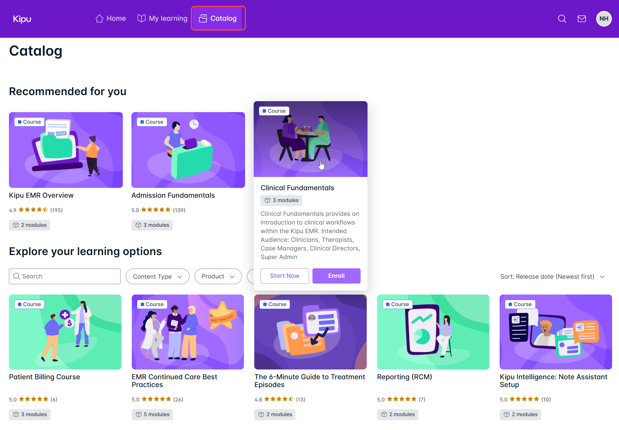 If you are interested in browsing the catalog of courses to discover materials beyond the ones assigned to you, you can click Catalog. To add a course, click on it or hover over it, then select the Enroll button to add it to the My learning and Home tabs. Otherwise, you can simply click Start Now.