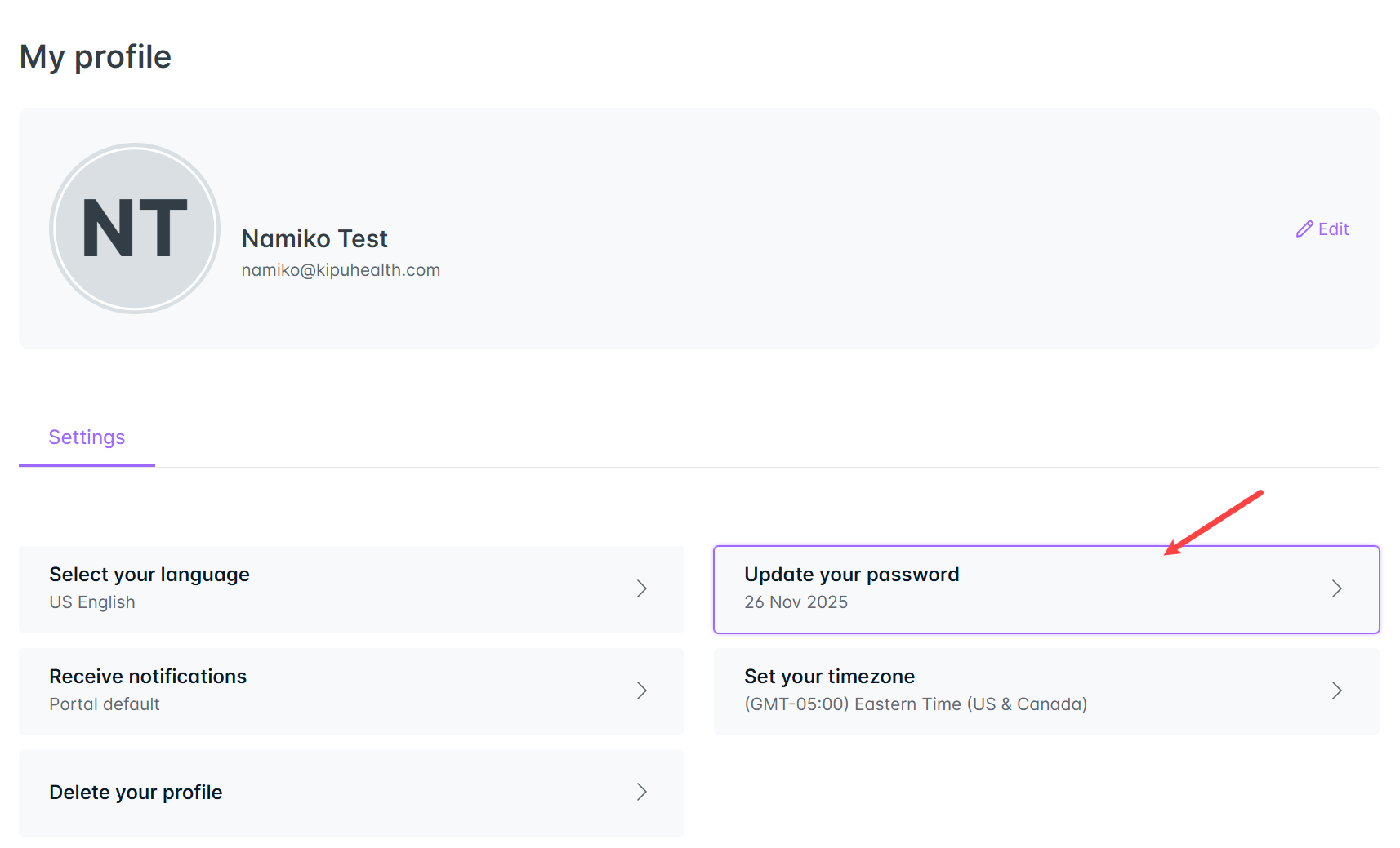 - To change your password or make other changes to your account, click on your initials, and then on your name.