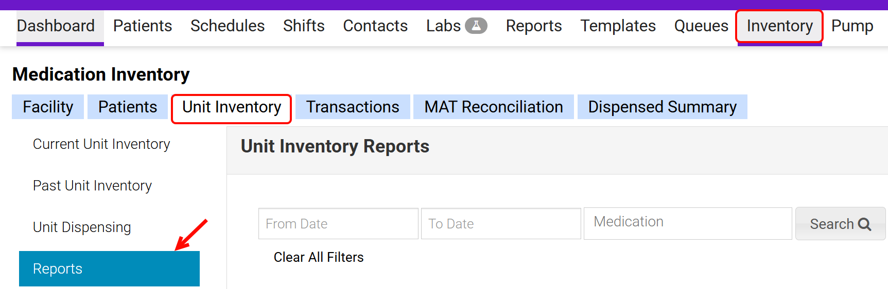 - Click on the Inventory tab in the header, select Unit Inventory, and click on Reports.