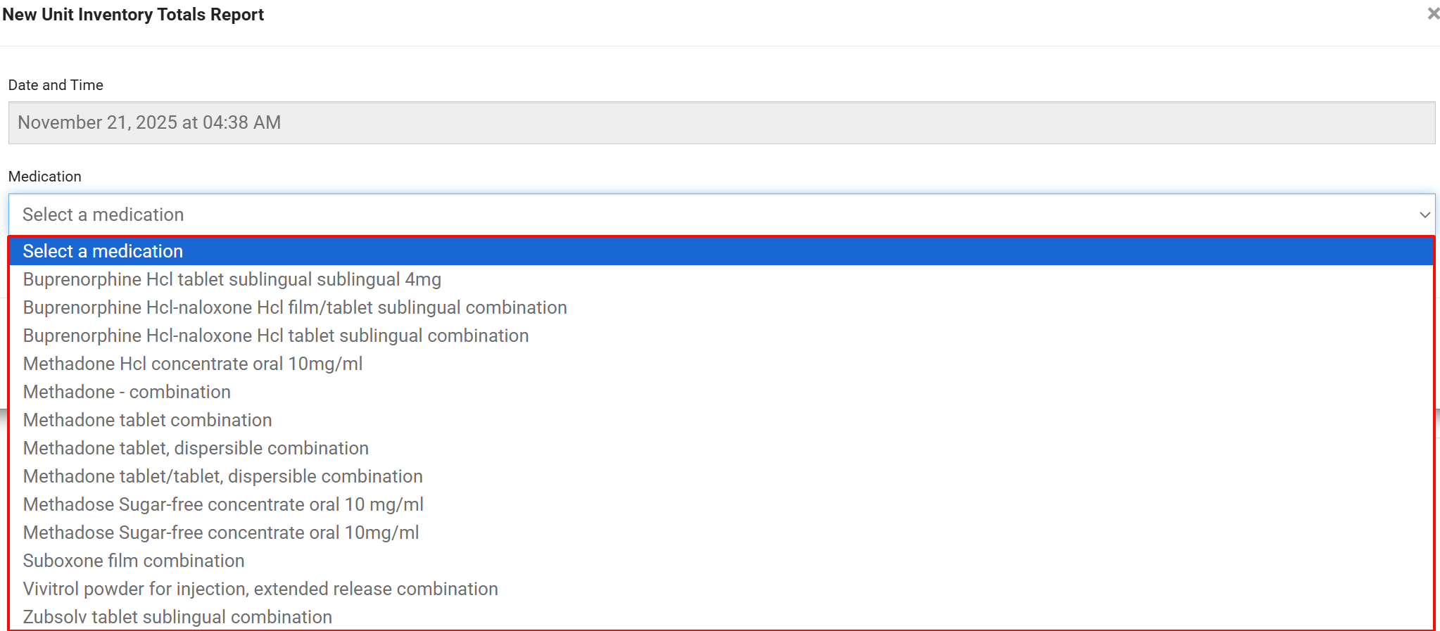 - Select the Medication to report on from the drop-down list.