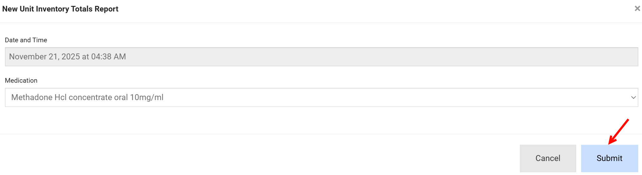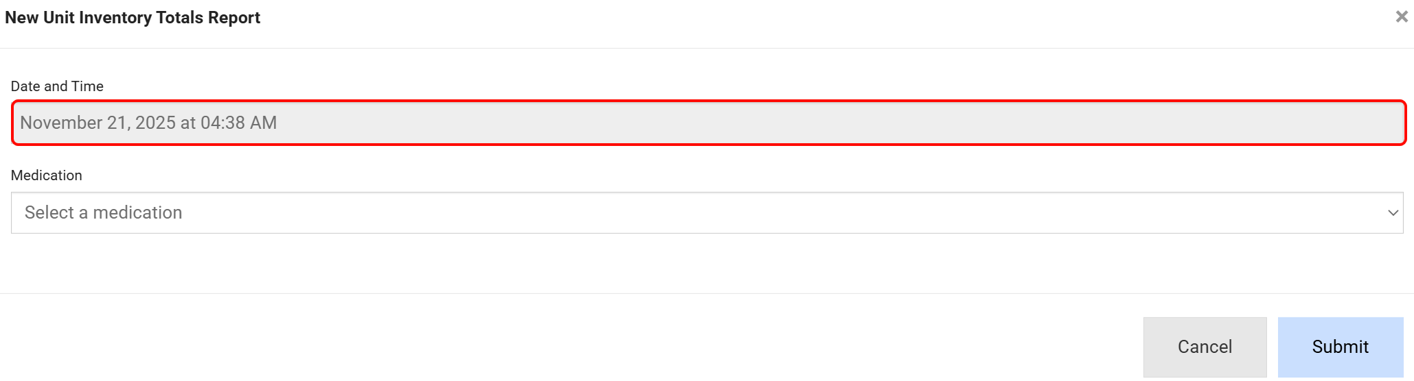- In the New Unit Inventory Totals Report window, confirm the Date and Time (auto-filled and not editable).