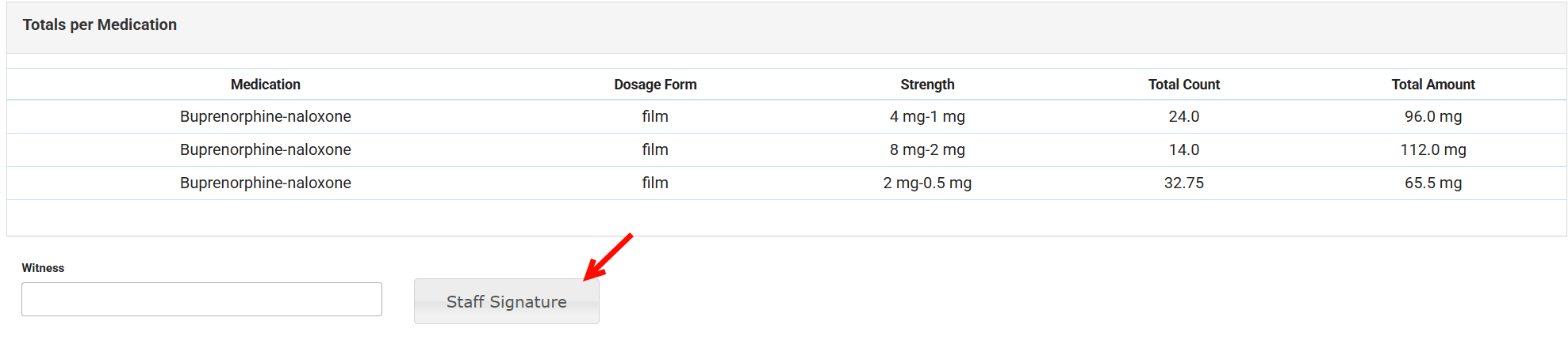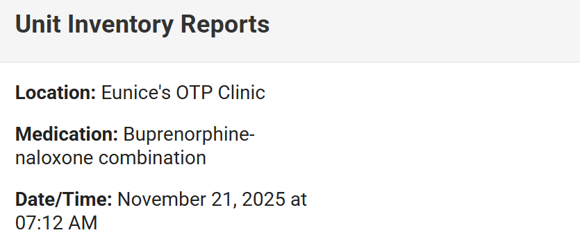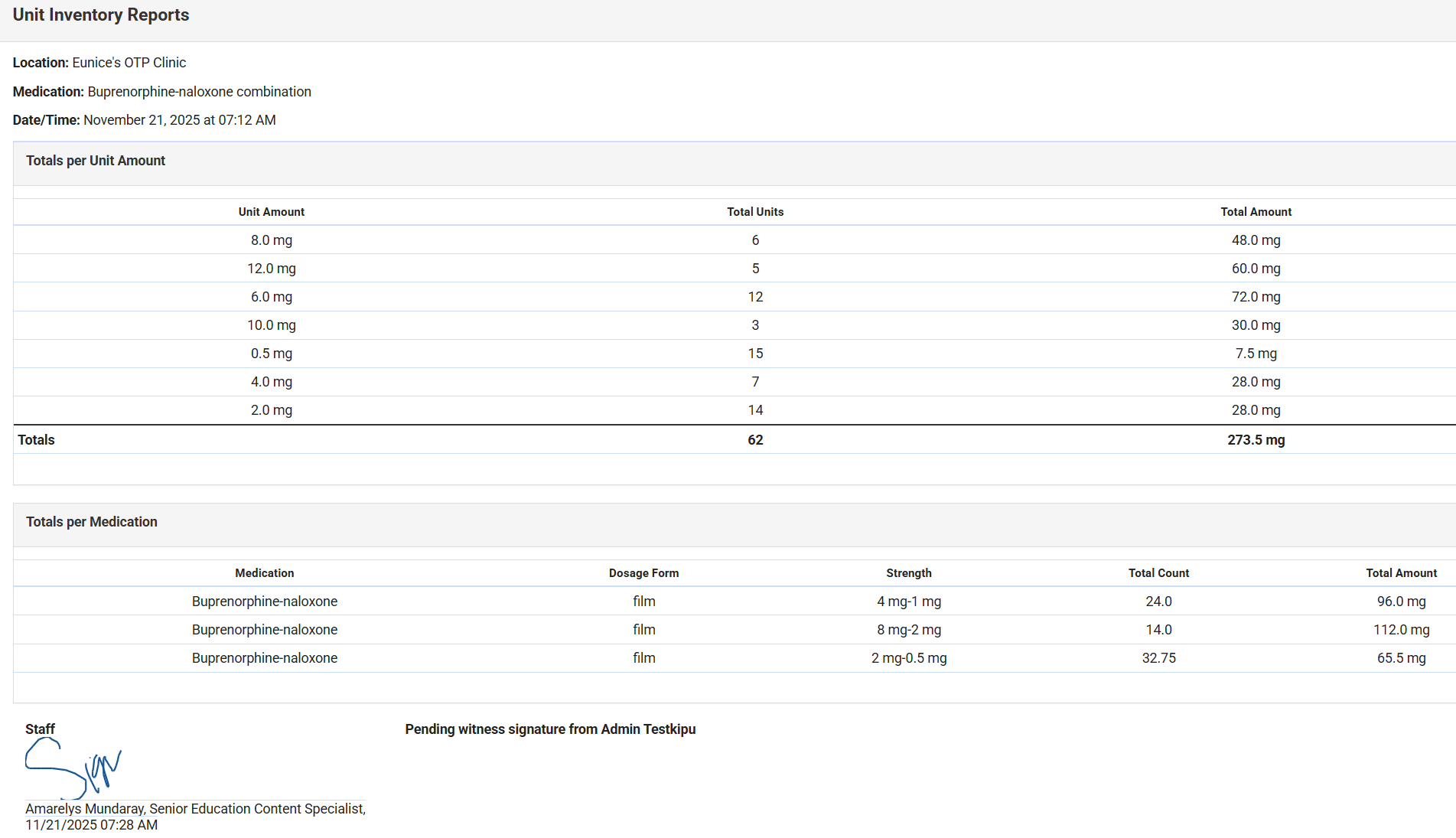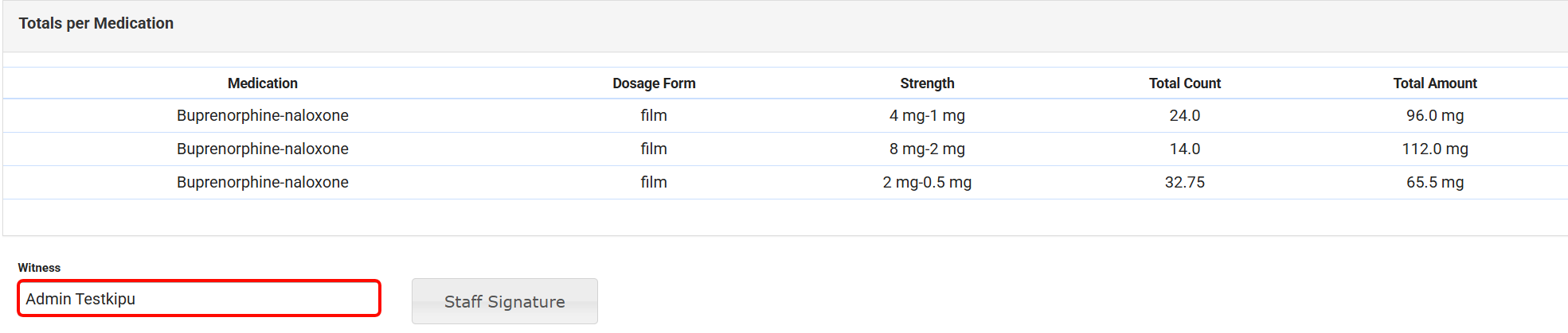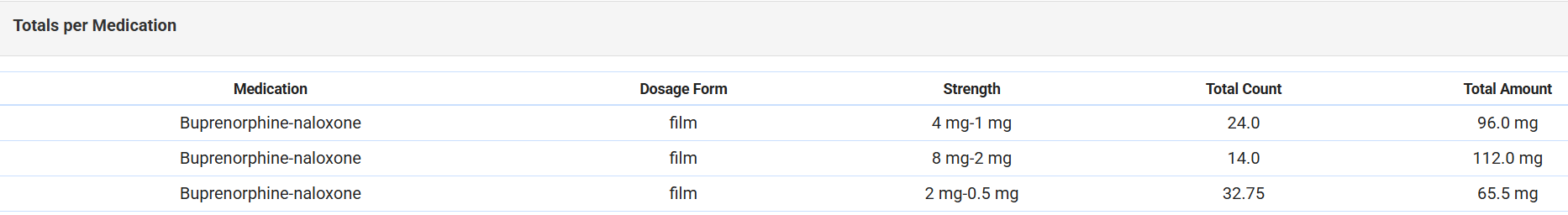 Totals per Medication Table: Shows total tablets/films per medication strength based on how units were dispensed and what remains in Current Unit Inventory.