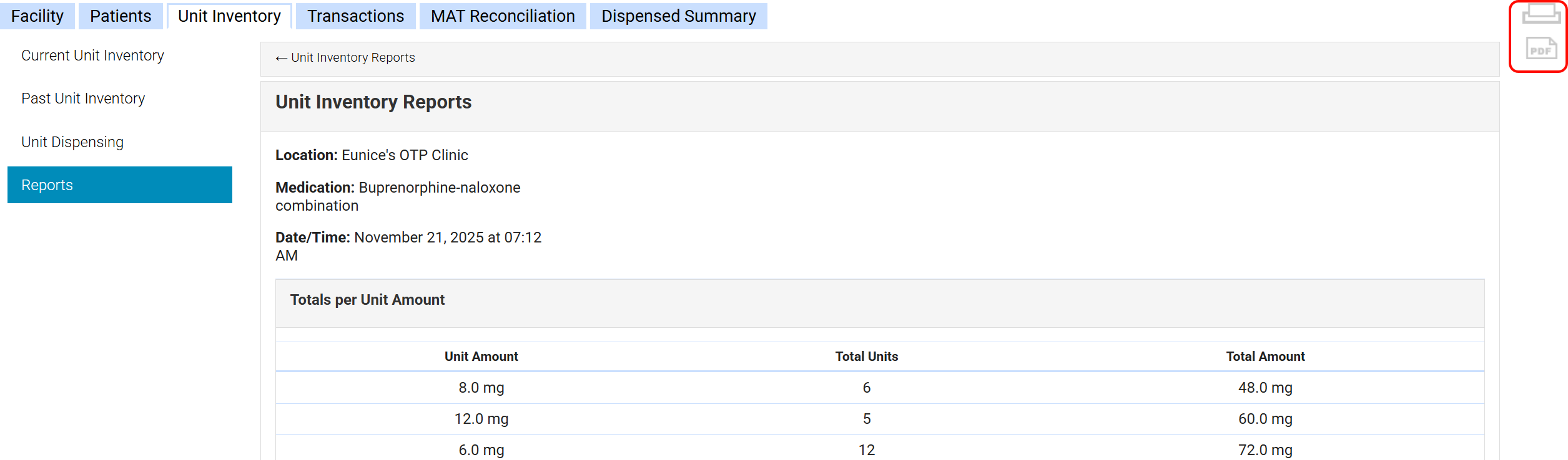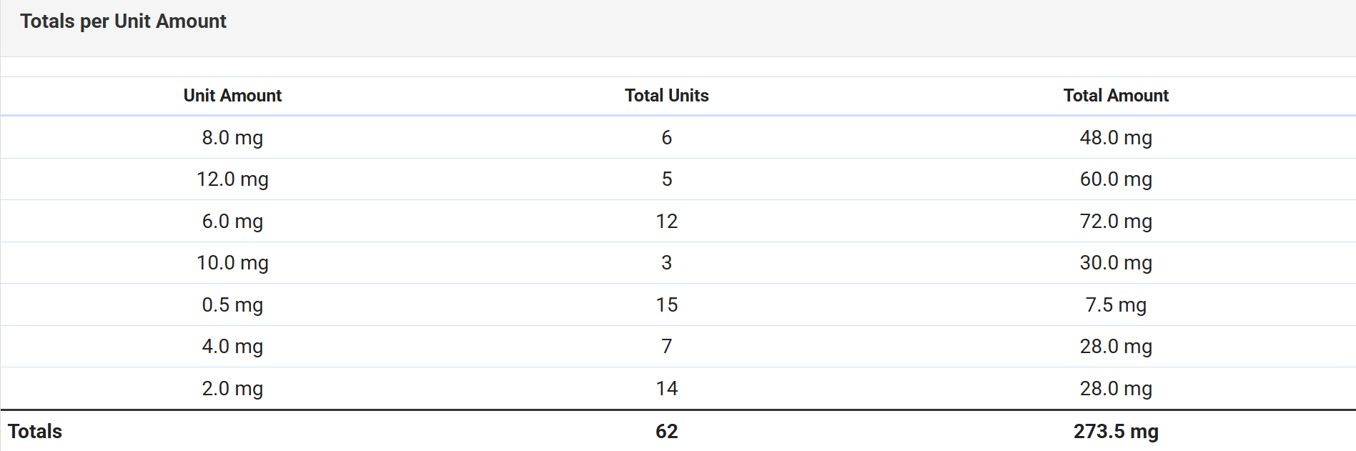 - Total Amount: Displays the total amount of medication in mg per unit amount (Unit Amount × Total Units).
