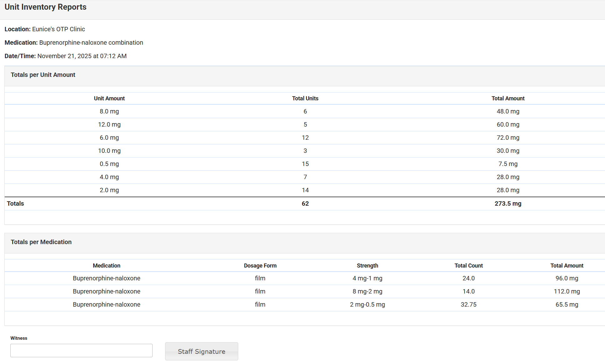 - The report displays the Staff Signature and Witness Signature at the bottom.