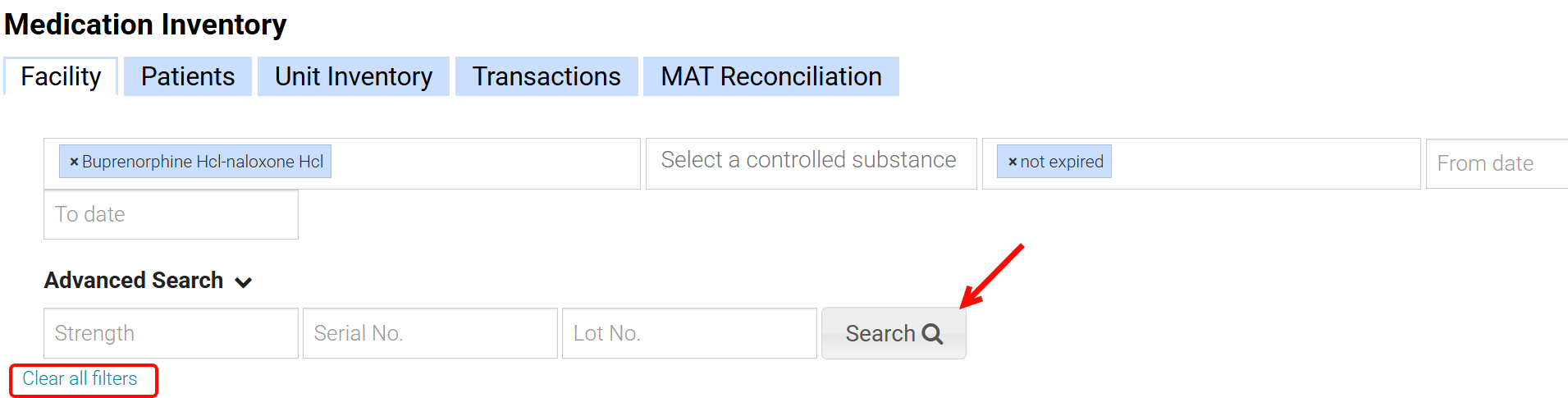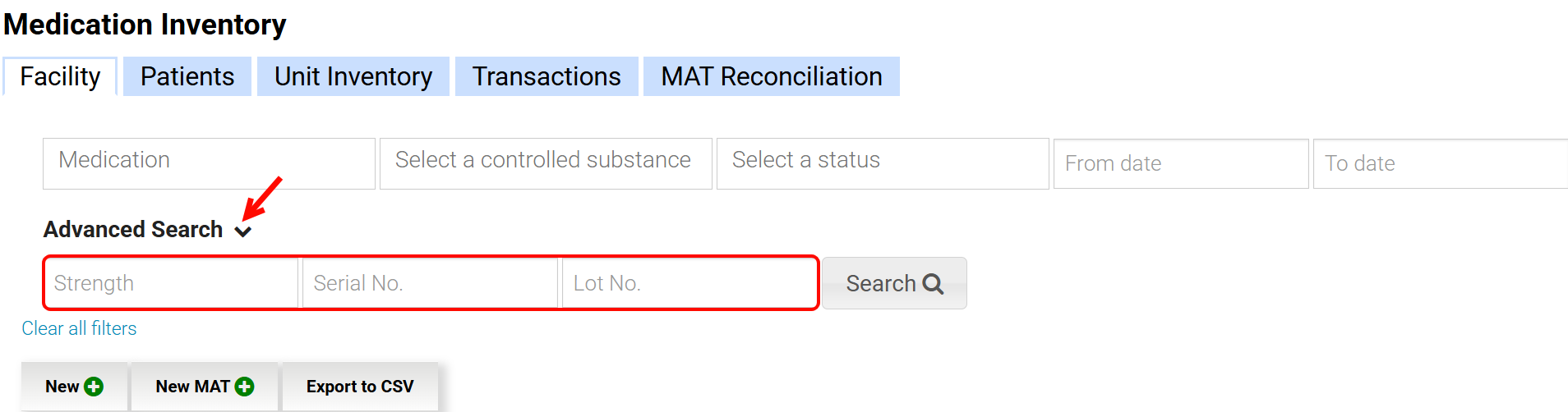 - Use the Advanced Search fields to search by strength, serial number, or lot number.