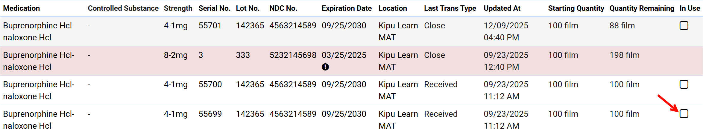 - In the far-right column, select the In Use checkbox next to the medication you want to dispense.