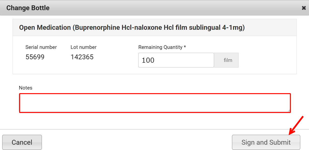 - In the Change Bottle window, review the Remaining Quantity field to verify the count before dispensing.