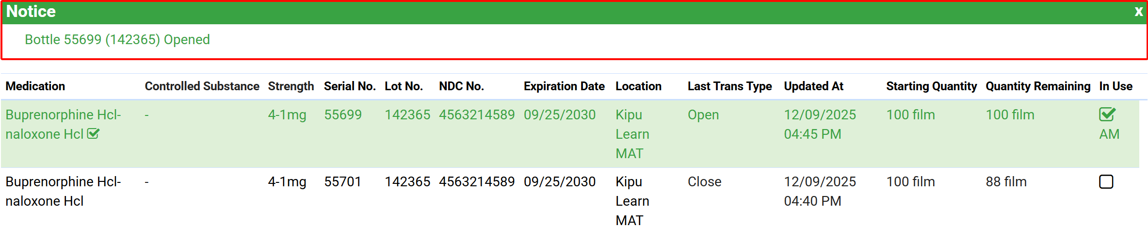 - All opened medications appear in green and show the initials of the user who opened the bottle in the In Use column.