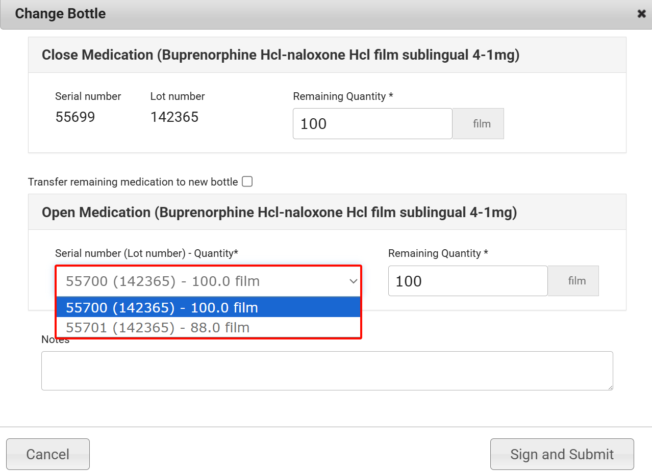 - Use the Serial Number (Lot number) Quantity drop-down to select the new bottle.