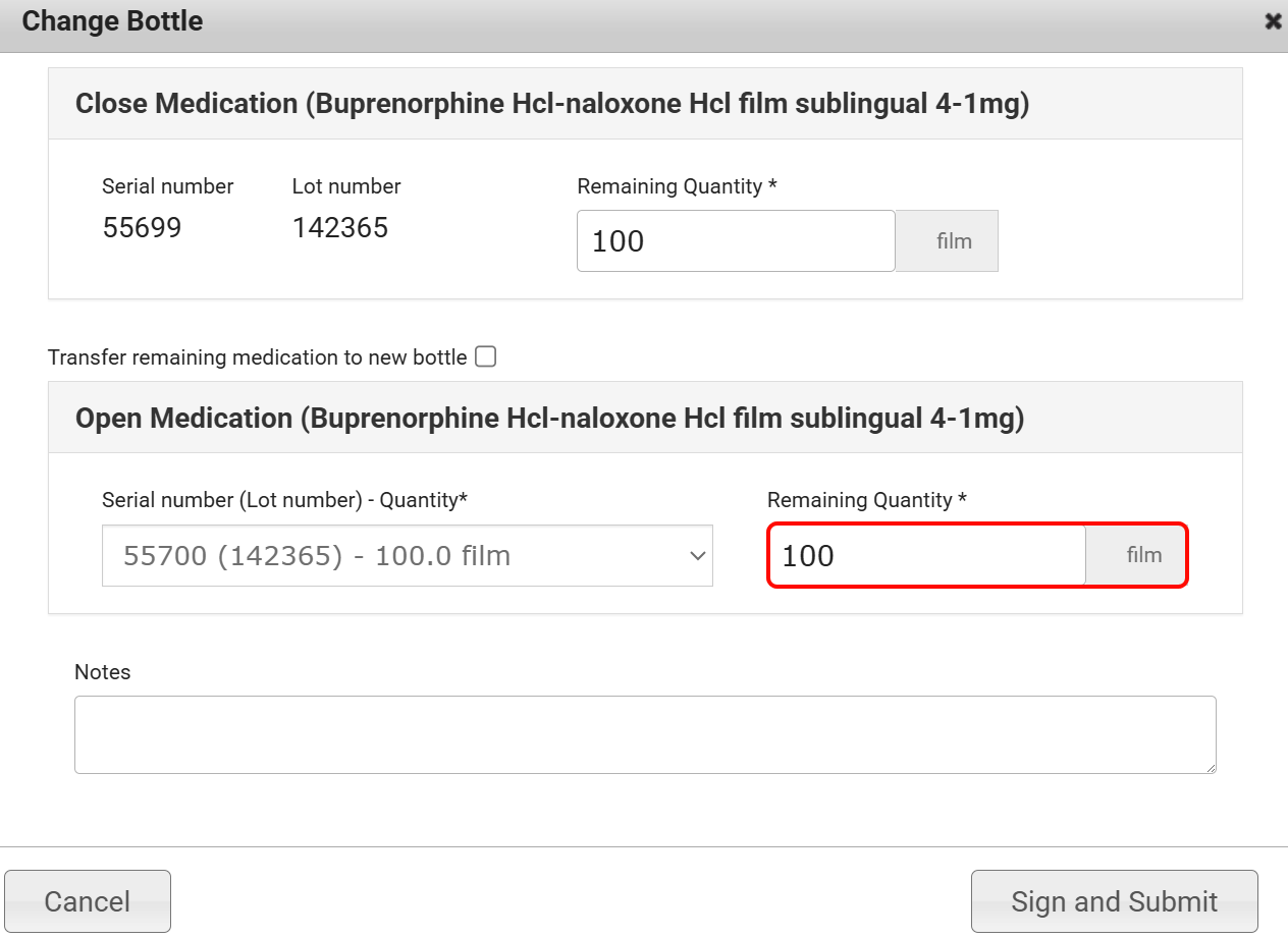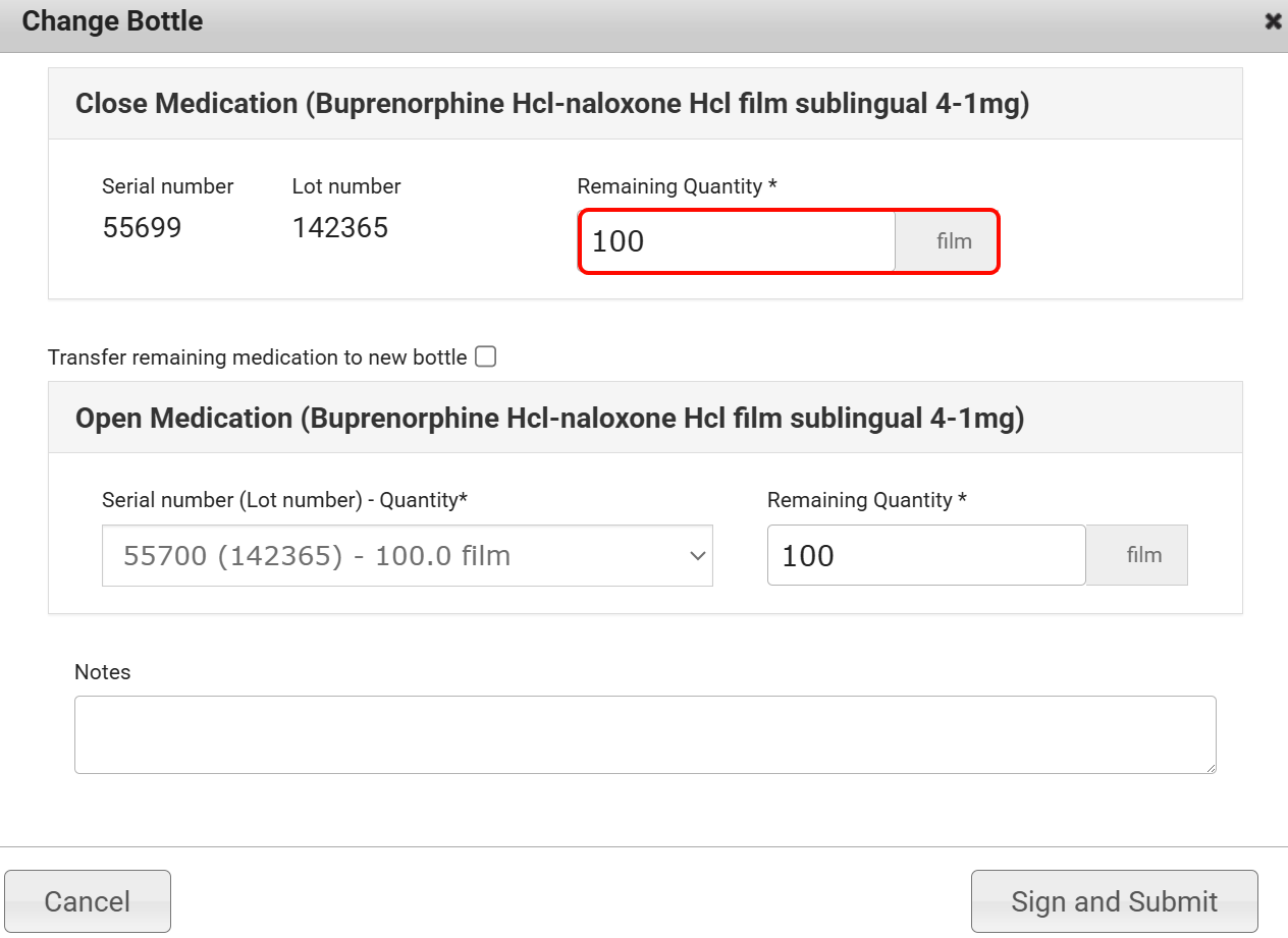 - In the Change Bottle window, review the Remaining Quantity field to verify the count before closing the bottle.