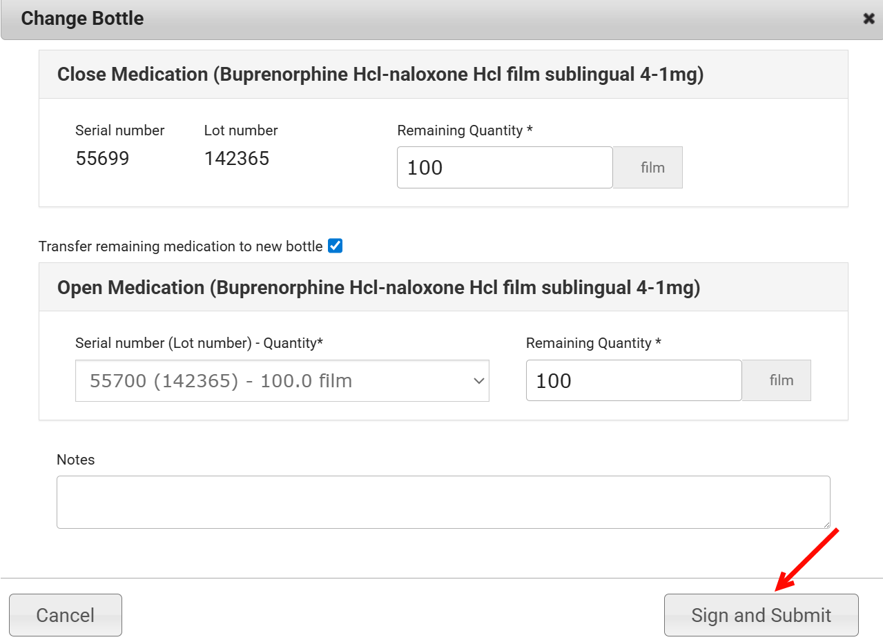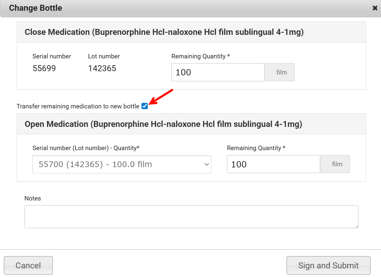 - If you are transferring the medication, click on the Transfer remaining medication to new bottle checkbox.