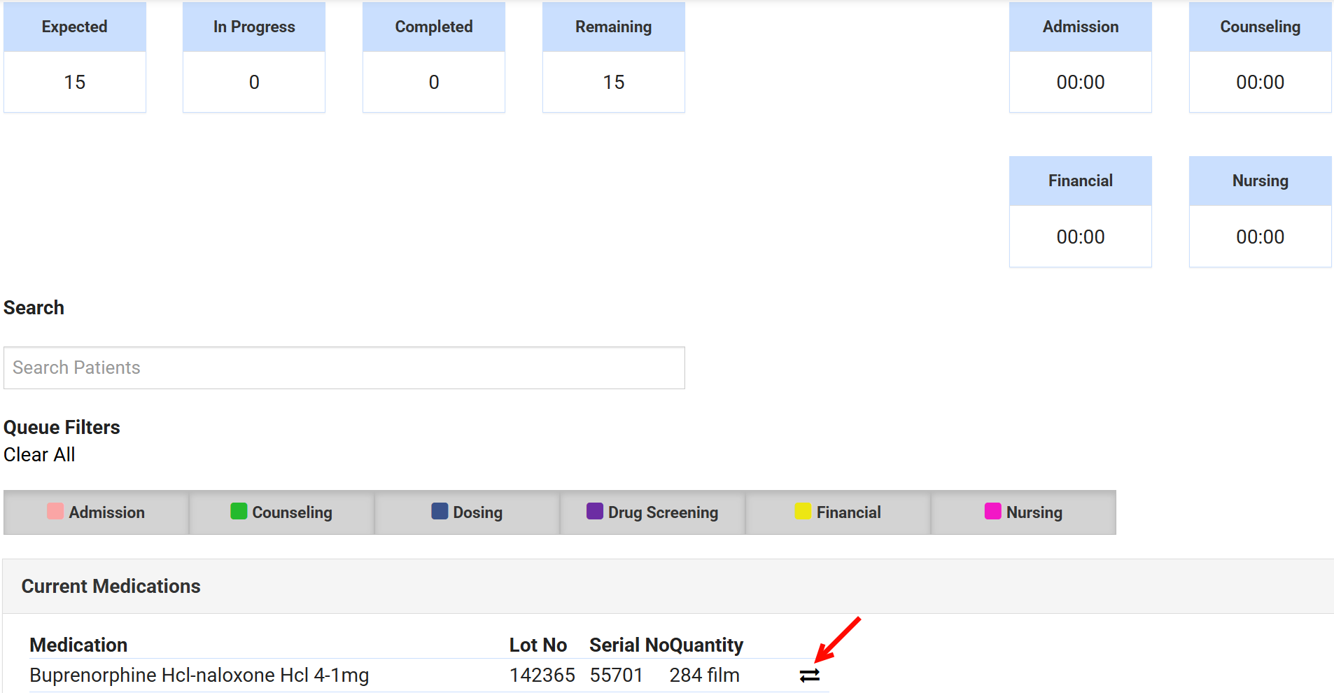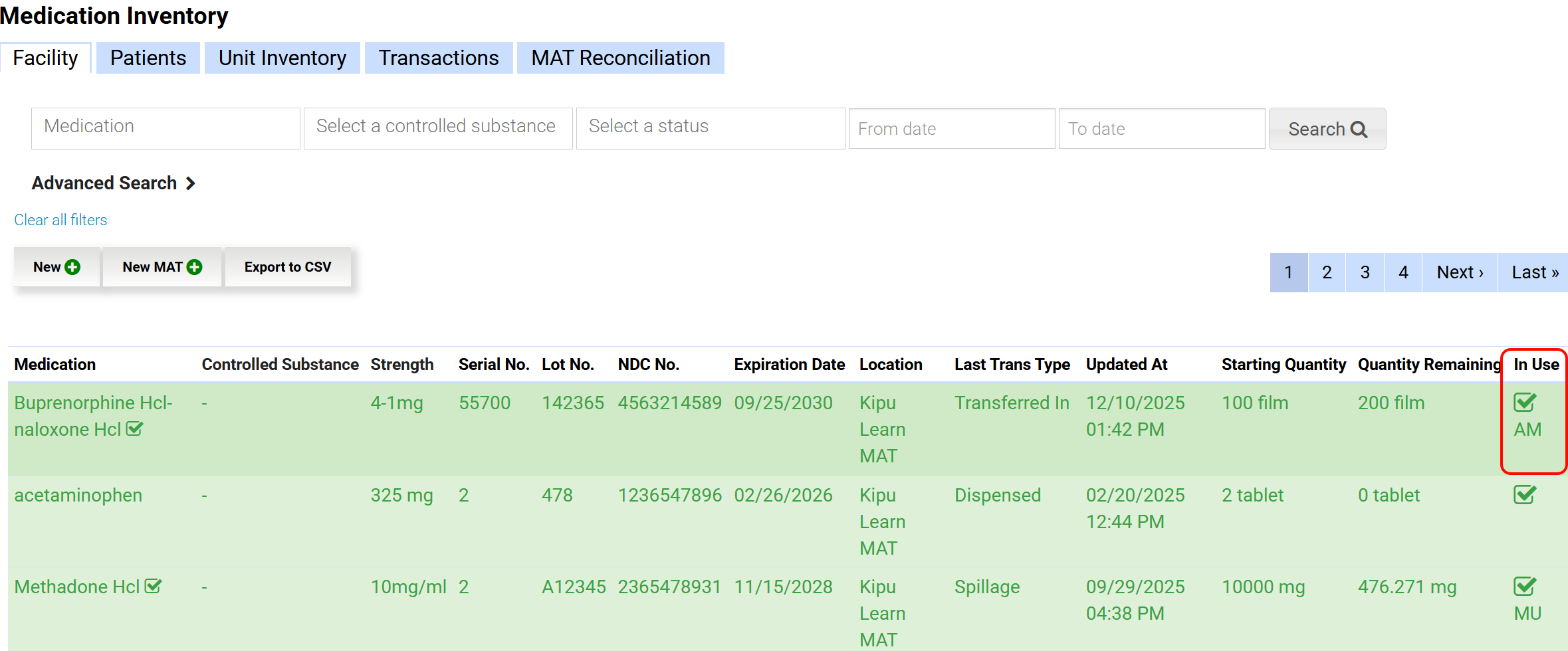 - The bottle will appear as In Use in the Inventory. You can review the transaction by selecting the medication name.