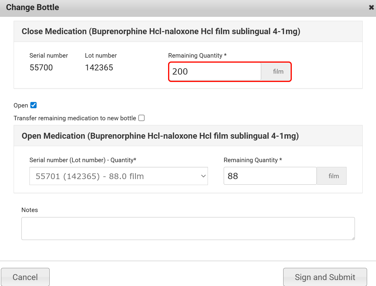 - Review the Remaining Quantity to confirm the amount left in the bottle.