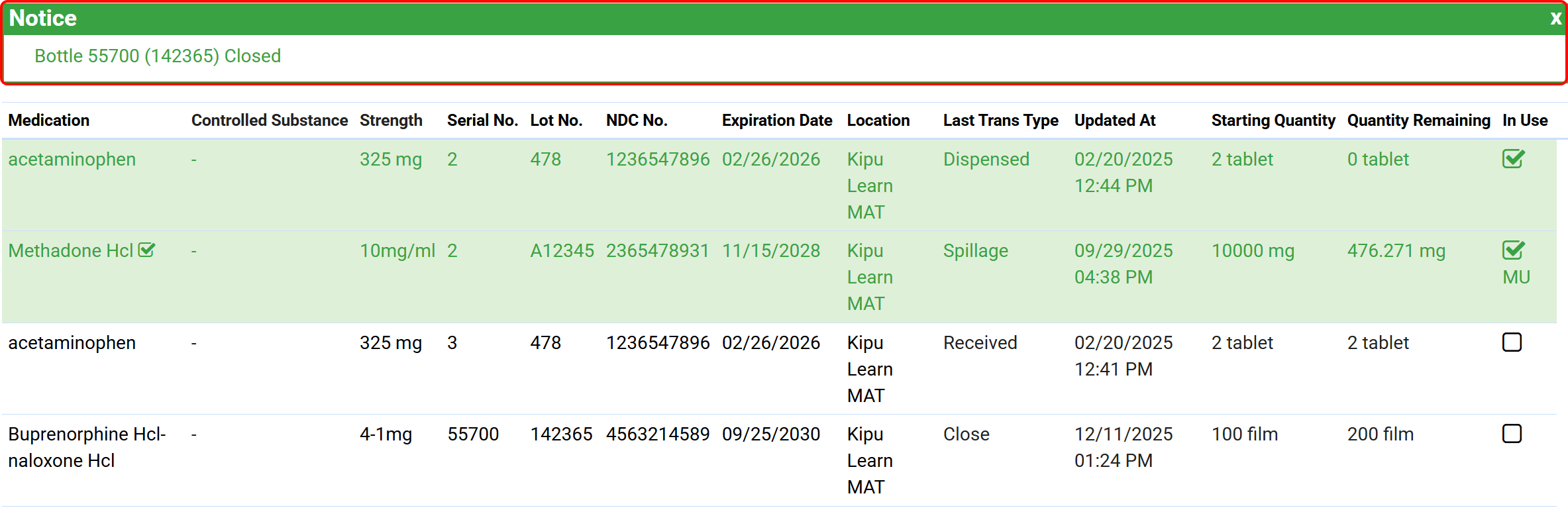 A green confirmation message will appear showing the bottle was successfully closed. The notice includes the serial and lot numbers, and your initials will be removed from the In Use column.