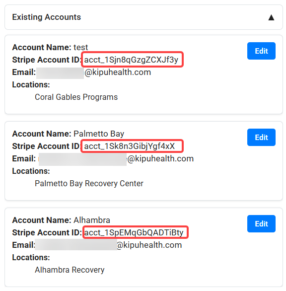 • For questions about your Stripe account or payouts, contact Stripe's support team directly. Please have your Stripe account number available. You can find your Stripe account number by navigating to Settings > Billing Audit Tool > Patient Payments. Under the Create Connected Account section is an expandable section called Existing accounts. Click on it to expand, and then locate the Stripe Account ID.
