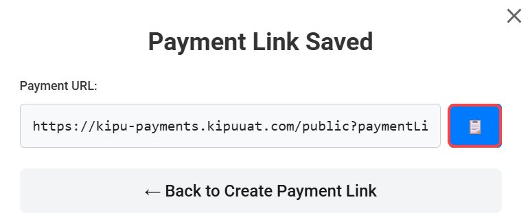 - The payment link will save. Now, click the copy icon to copy the link. You can send the link to the patient by pasting it into an email or text message, embedding it into your workflow, or pasting it anywhere else, as needed.