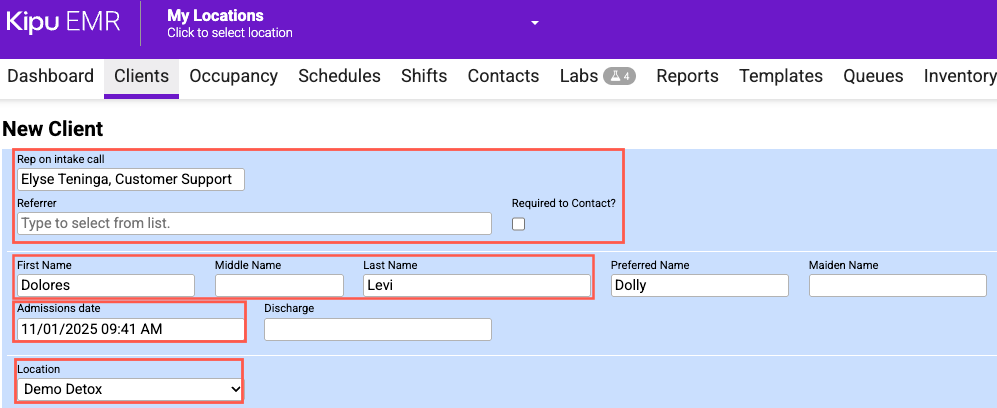 - Rep on Intake Call: The user who enters the information can be updated if needed.