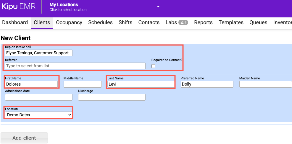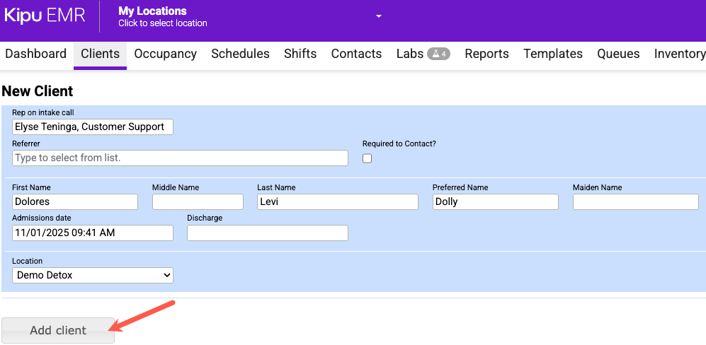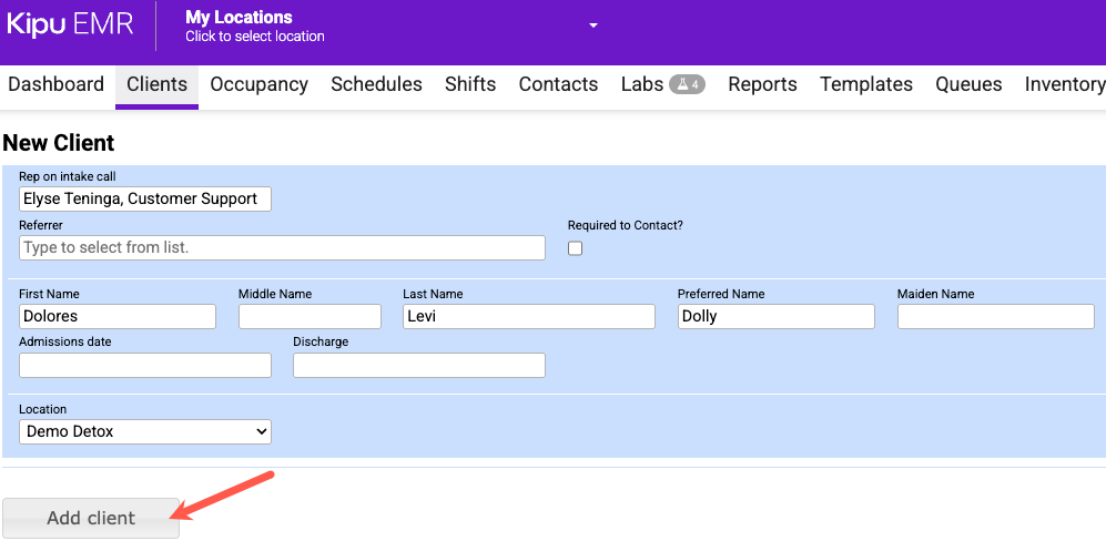 - Then click Add Client. This will automatically send a record of the patient's chart to the RCM as a Prospective Patient.