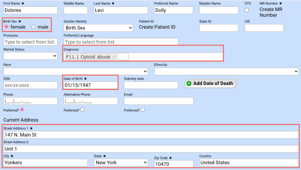 - First, Middle, Last Name: Enter the patient's name. Note: Only the first and last are required.