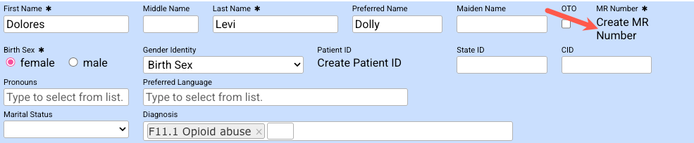 - When complete, click Create MR Number. This action will create an MR Number and send the patient's chart information to the RCM, where an Admitted Patient profile will be created.