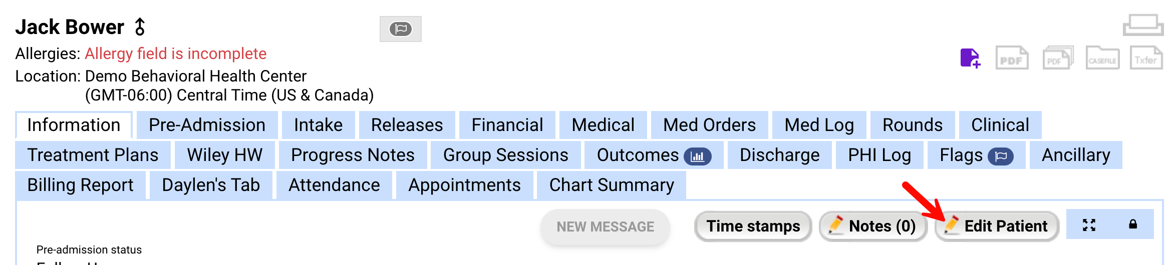 - To convert a pre-admit patient to an admitted patient, navigate to the patient's chart and click Edit Patient.