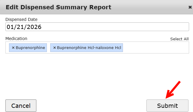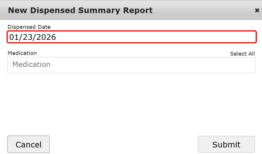 - In the New Dispensed Summary Report window, enter a date for which dispensing activity will be reported.