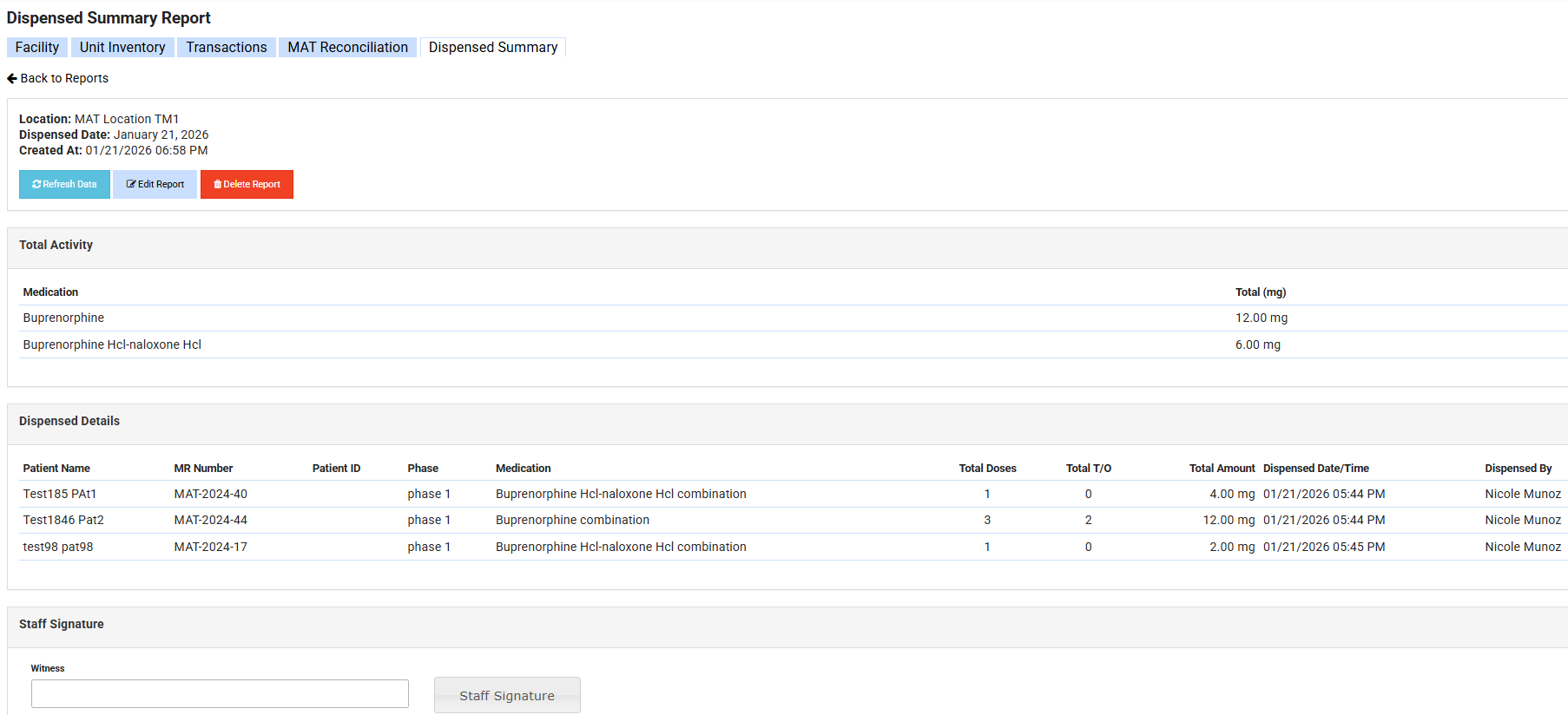 The Dispensed Summary Report can be exported as a PDF or printed directly and includes all data across multiple pages, along with staff and witness signatures (if applicable) and their corresponding timestamps.