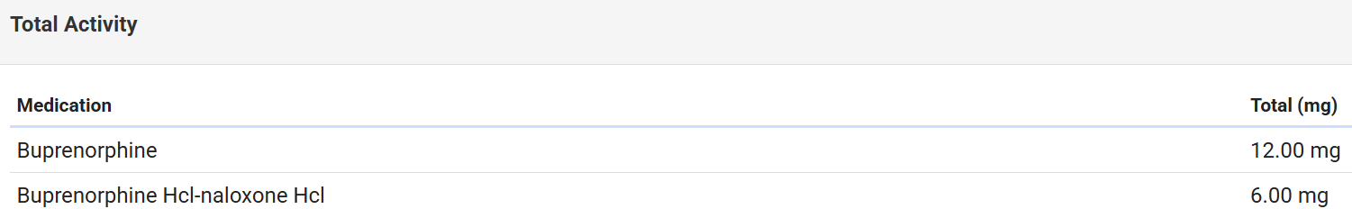 Total Amount (mg): The cumulative amount of medication dispensed to the patient, calculated in milligrams for the selected date range.