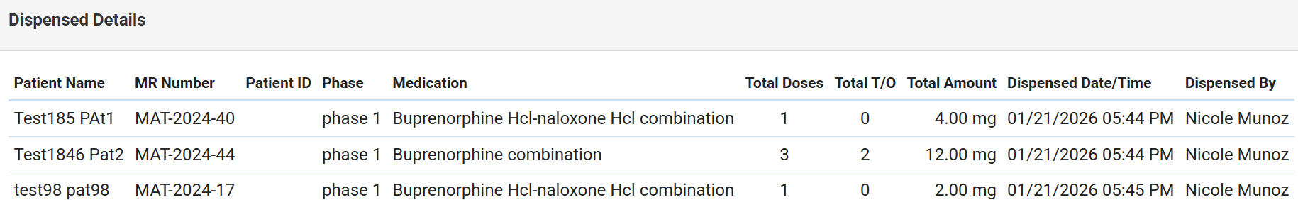 - Dispensed By: If doses were dispensed by multiple users, the first user is displayed.