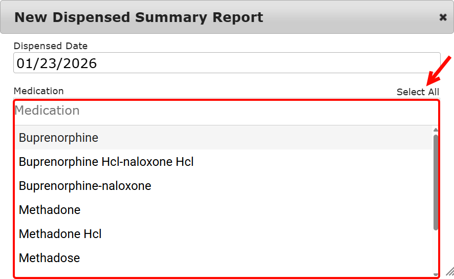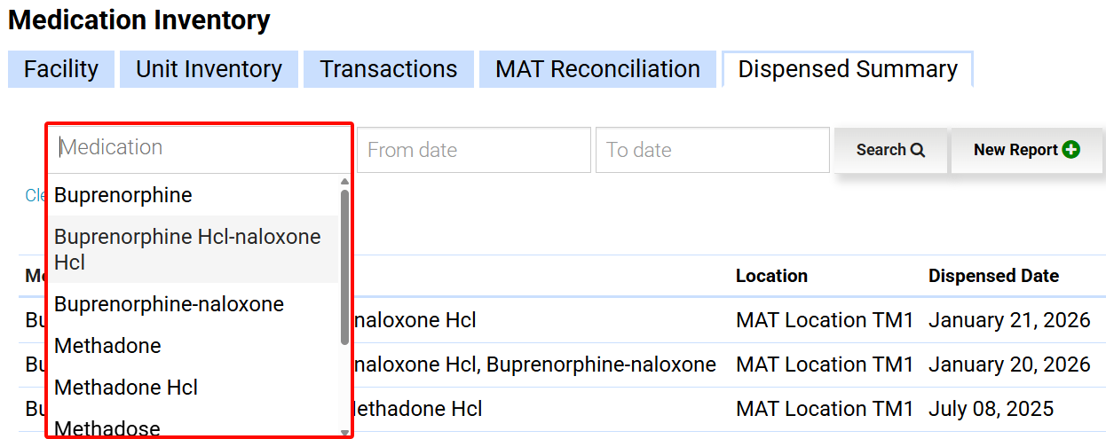 - Then select one or more medications from the multi-select dropdown. The available medications match those configured in the instance and used when creating MAT Orders. Alternatively, click Select All to include all medications.