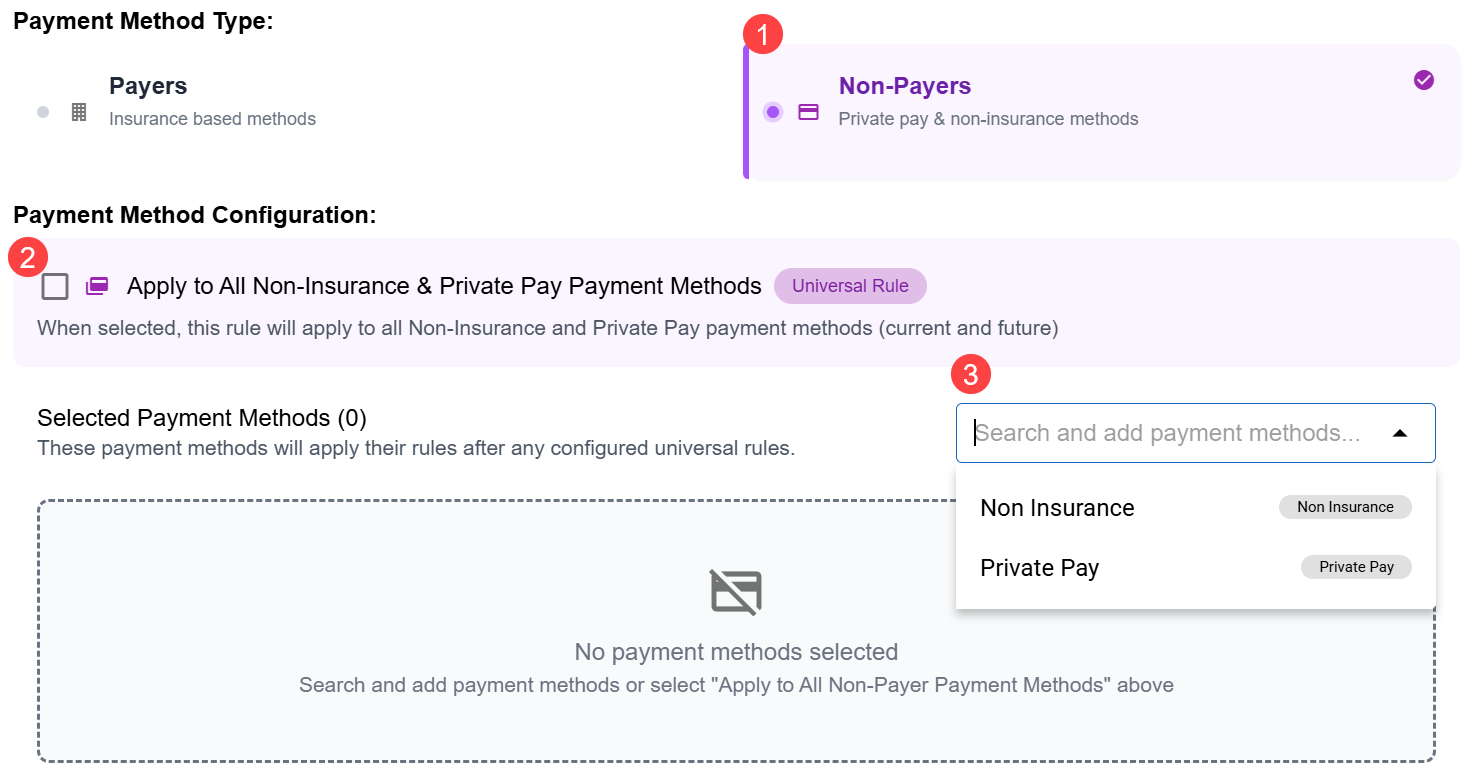 - Non-Payers: Choose this option for billing rules where the payment method is non-insurance, or private pay.