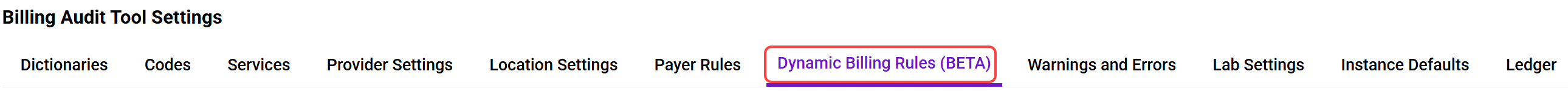The Dynamic Billing Rules (Beta) tab allows users to create billing rules for specific payers and locations. These rules govern the behavior of billing items as they appear in Reports > Billing Audit Tool.