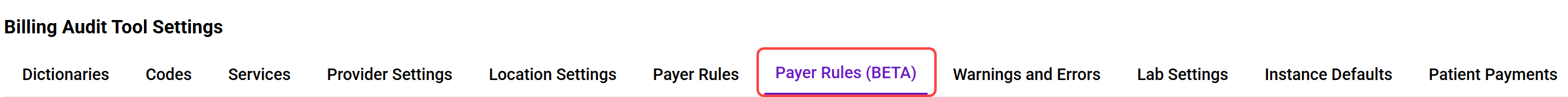 The Payer Rules tab allows users to create billing rules for specific payers and locations. These rules govern the behavior of billing items as they appear in Reports > Billing Audit Tool.