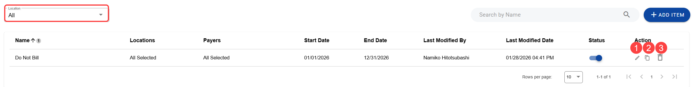 From the landing page, you can view, edit, delete, copy, enable, or disable all existing payer rules. You can use the Location drop-down to view payer rules tied to a specific location.
