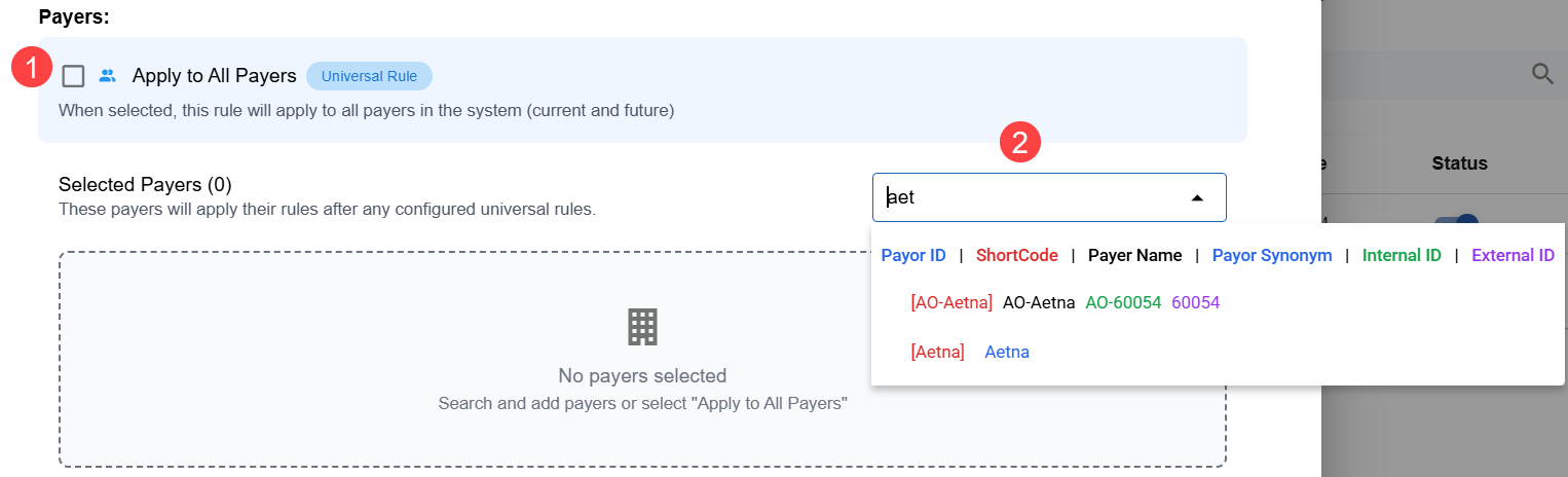 - Selected Payers: Search for the desired payer. Kipu RCM integrated payers appear with an [AO-] prefix. If you need to have the same rule available for multiple payers, add them all here.