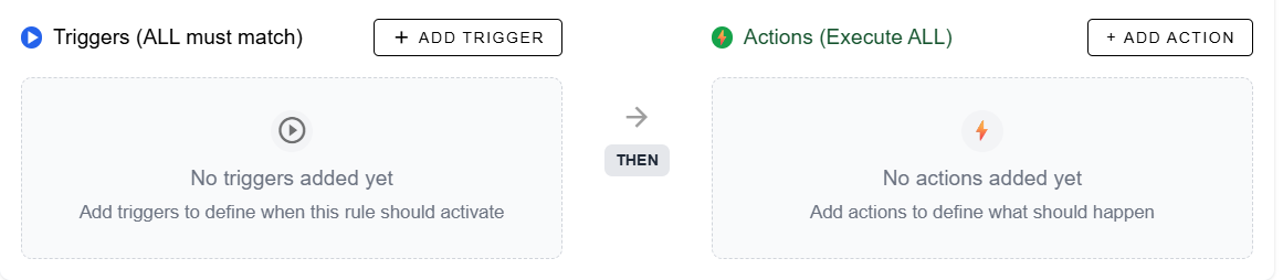 - Before we get into the actions and triggers, when you have more than one rule, you can click on the two rows of vertical dots and drag and drop the rule into the desired order. Click on the trash icon to delete a rule.