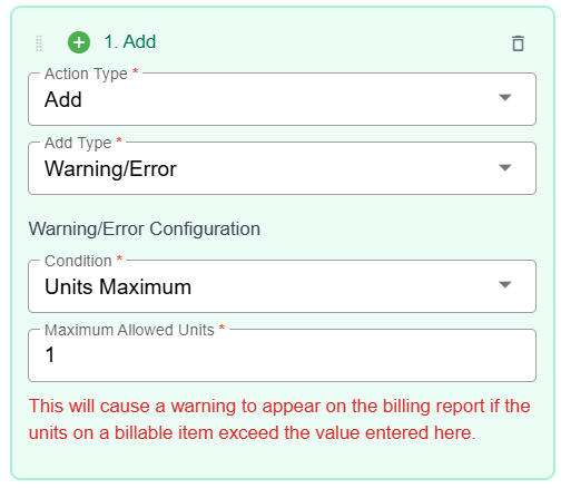 You can add modifiers and the following warnings, and errors to billing items that meet the created trigger options.