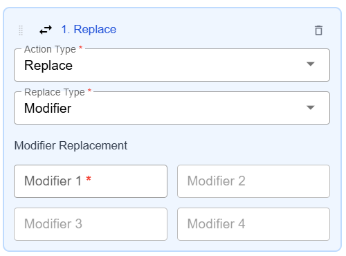 Use a Replace action type to replace ancillary konnectors, billing providers, codes, claim formats, modifiers, places of service, present on admission values, bill types, and unit types.