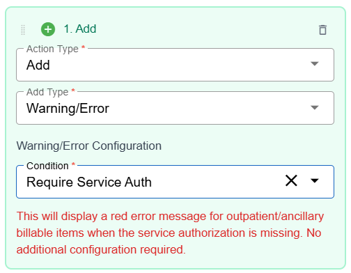Note that because each rule is much more customizable, if you need items to require a service auth, use the Add > Warning/Error > Requires Service Auth action option.