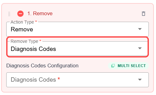 - To remove specific diagnosis codes from billable items that meet the trigger criteria established in a rule, choose Diagnosis Codes from the Remove Type drop-down