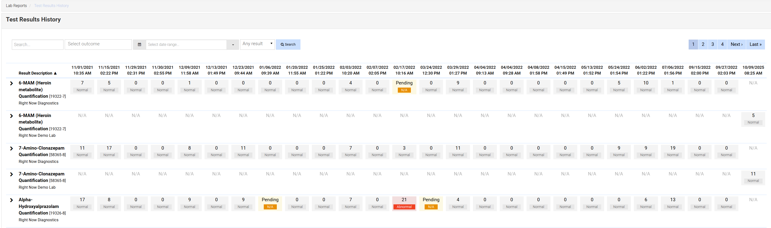 Labs: We have updated Test Result History filters to separate Results to Review (red) and No Outcome (yellow). Previously, Results to Review included both abnormal and N/A results, making the history report less efficient. Check out this article for more information about lab results.