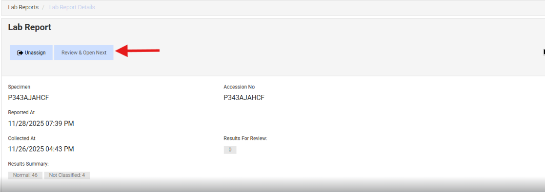 Labs: Replaced the Review button with Review & Open Next on lab reports to streamline the process of reviewing and signing abnormal results for providers. Check out this article for more information.