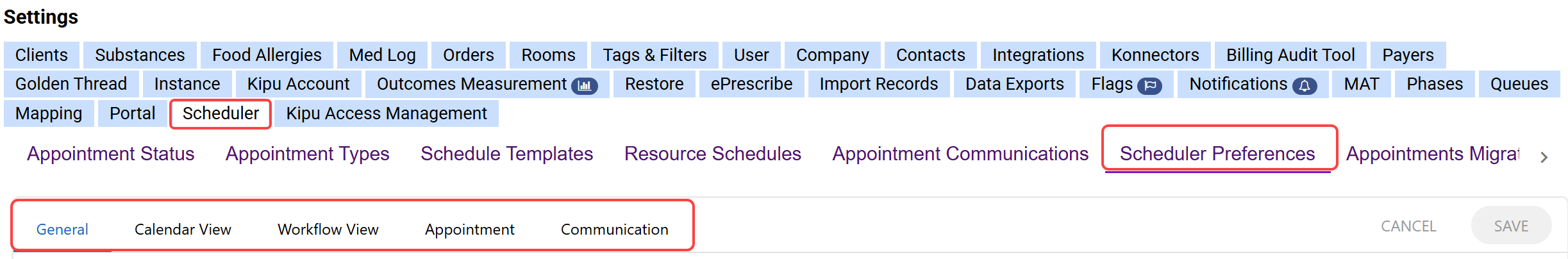 - Organized Tabs: Settings are now grouped into five tabs (General, Calendar View, Workflow View, Appointment, Communication) instead of one long scrolling page