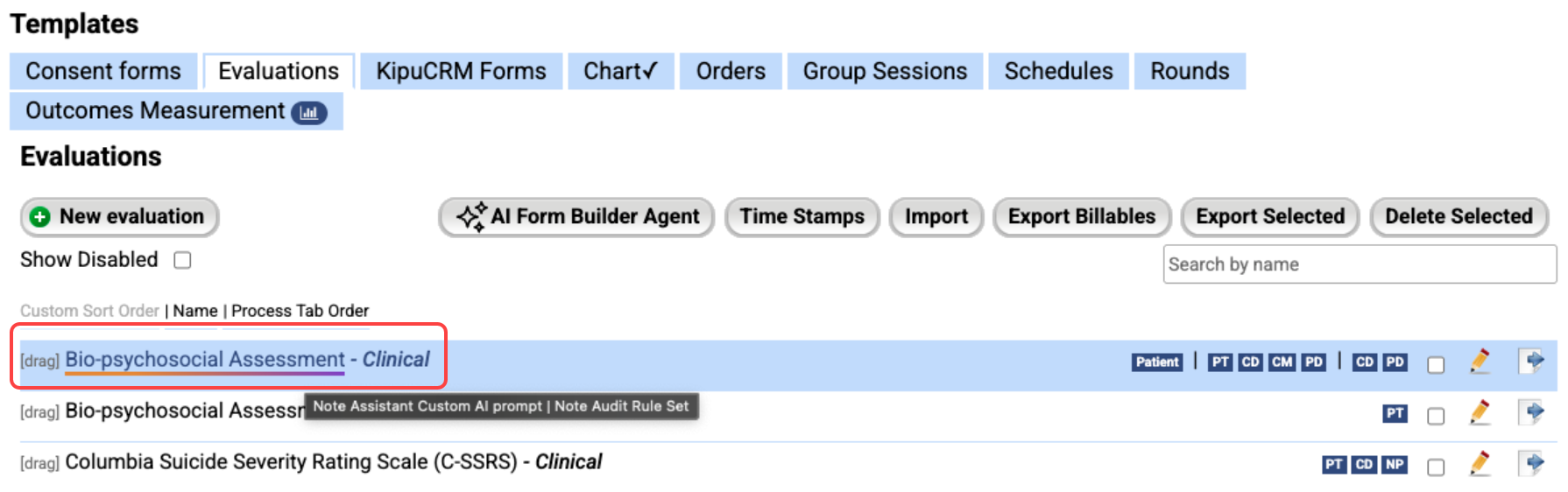 Kipu Intelligence (Note Audit/Note Assistant): Consent and Evaluation templates with AI formatting are now visually distinguishable by an underline under the title. Check out this article for more information on setting up Note Audit rule sets, and this article for information on setting up Note Assistant in evaluation and consent form templates.