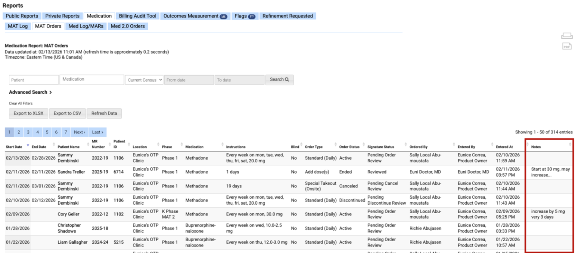 MAT Orders Report: A new Notes column has been added to Reports > Medication > MAT Orders, providing more comprehensive order information. Notes are also included in XLSX and CSV exports and are available when using the Print and PDF options. Check out this article for more information about the MAT Orders report.