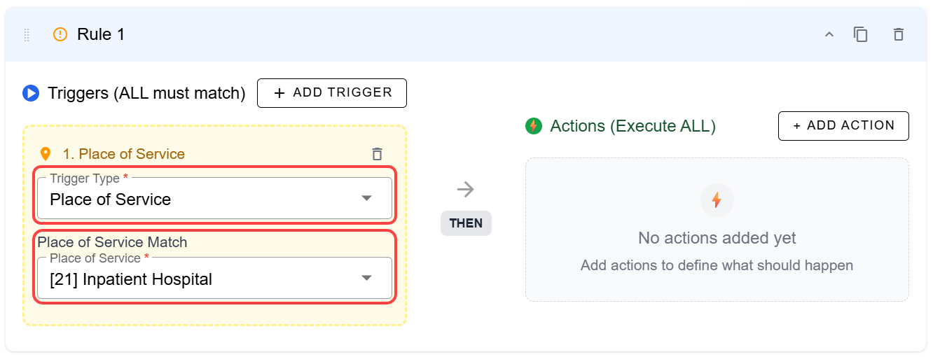 - To begin, add a trigger, and choose Place of Service as the trigger type. You must also choose the place of service match from the drop-down.