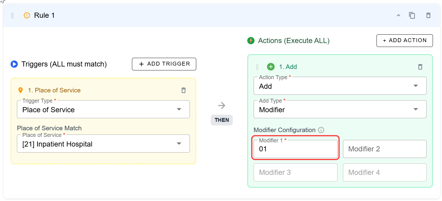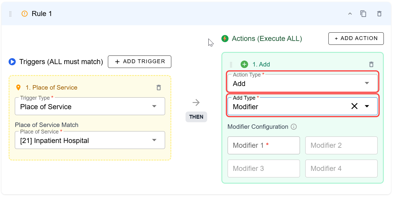 Add Modifier rules will automatically assign modifiers for payers that require them based on the triggers chosen. In this example, we are going create a rule that automatically assigns modifiers based on place of service (but this trigger could be any one of the other available trigger types as well).